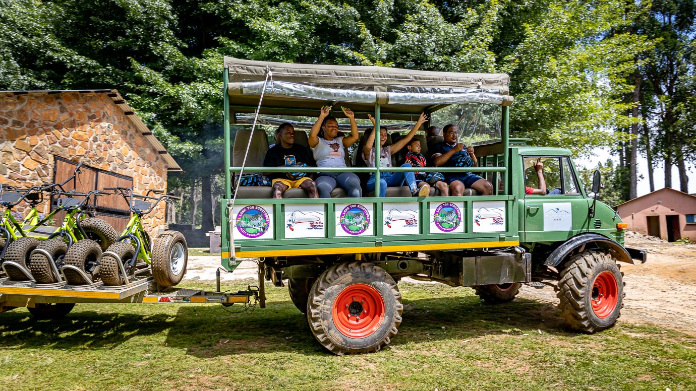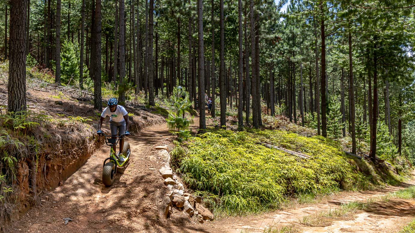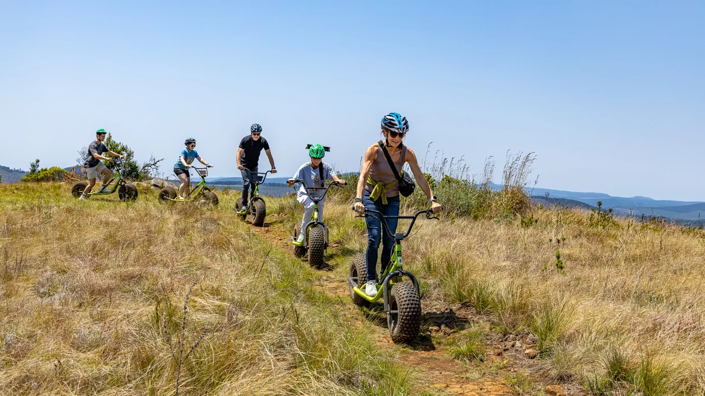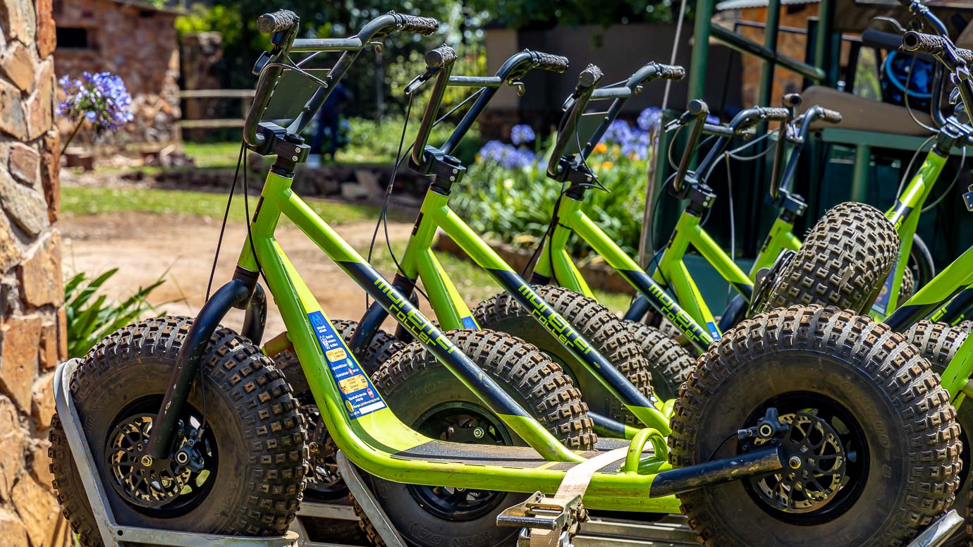 If you can ride a bicycle, you can ride a scooter! This is a unique experience of sensational downhill runs in the mountains of the Long Tom Pass. Starting at an altitude of 1765 metres above sea level on a Monster Scooter, single track through grasslands, patches of indigenous forest and vast pine plantations. The scooters are non-motorized, making this an eco-friendly adventure.